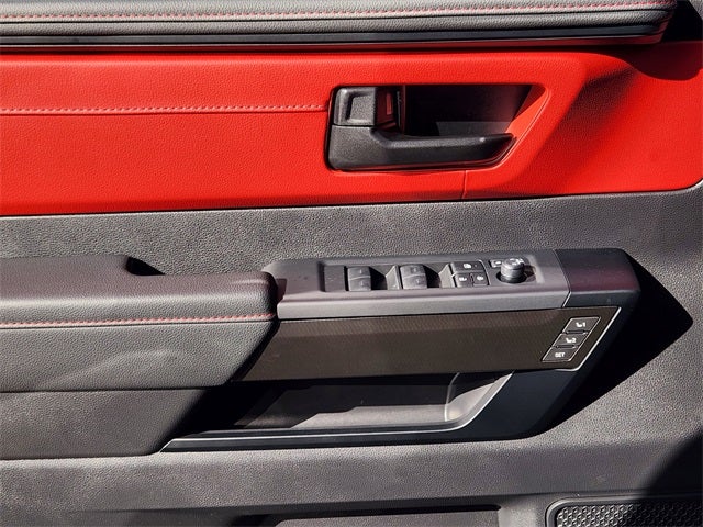 - tailgate release and remote illuminated entry~Interior@Power tilt/slide panoramic roof with power sunshade~Interior@Power vertical rear window with defogger and privacy glass~Interior@Acoustic laminated windshield~Interior@Power windows with one-touch auto up/down and jam protection~Interior@Front and rear LED maplights~Interior@Illuminated center console storage bin and glove box~Interior@TRD Pro "TOYOTA" heritage instrument panel badge~Interior@Soft-touch instrument panel