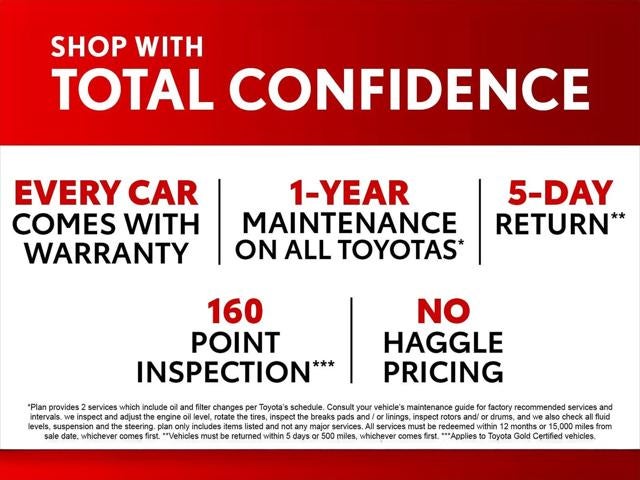 - *4.99% APR financing up to 72 months based on approved tier 1 credit and expires 03/02/2026. TOYOTA CERTIFIED =7 Year or 100K Warranty* 1 YEAR MAINTENANCE INCLUDED! Want a NO HAGGLE & STRESS FREE Shopping experience? Contact us!